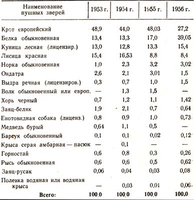 Удельный вес различных зверей (в процентах) в пушных заготовках Вологодской области в 1953 – 1956 гг. (по данным госохотинспекции)