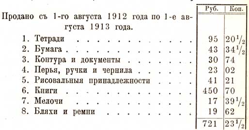С нынешняго года потребительный склад при школе начал функционировать на более правильных основаниях. В начале учебнаго года был выработан проект устава, который затем поступил на разсмотрение и утверждение Общаго Собрания учеников. Выработанные бланки документов и составленная инструкция по счетоводству способствовали лучшему ознакомлению со счетоводными книгами и дали возможность привлечь к ведению книг всех учеников последняго класса. Между ними были распределены книги, которыя им нужно было вести в течение всей недели. Во II полугодии вспомогательныя книги поручались уже ученикам II класса.