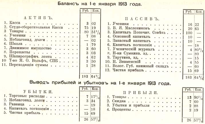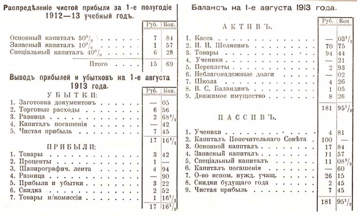Общия собрания в этом году созывались очень часто и хотя не были так многолюдны, как в прошлом году, но отличались большой сериозностью и деловитостью. Был образован особый фонд, при помощи котораго лавочка должна приносить временную помощь ученикам. Оборотныя средства лавочки увеличились благодаря большому отчислению из чистой прибыли в основной капитал.