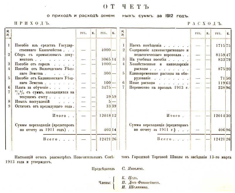 10 октября 1912 года окончились полномочия Председателя и членов Попечительнаго Совета Вологодской городской Торговой Школы, избранных Вологодской Городской Думой в 1908 году, согласно Уставу школы, на четырехлетний срок. Совете вследствие этого имеет честь представить Городской Думе краткий отчет о своей деятельности за истекшее четырехлетие.