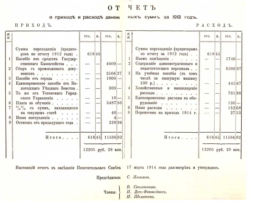 Подробные отчеты о приходе и расходе денежных сумм представлялись Советом по истечении каждаго года за исключением отчета за 1912 год, который будет представлен в непродолжительном времени. Точно также были представлены отчеты инспектора об учебно-воспитательной деятельности за каждый учебный год.