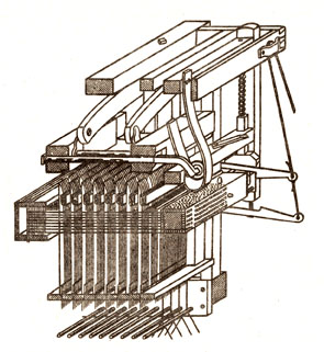 Однако мы немного отвлеклись... Вернемся к устройству жаккардовой машины. После подъема необходимого количества нитей основы (согласно рисунку переплетения) призма отходит от игольной доски и пружины приводят отжатые иглы и отогнутые крючки в исходное положение. Новый поворот призмы и нажим новой карты на игольную доску приводят к новому (согласно отверстиям карты) подъему определенных нитей основы. При использовании этой машины дергалыцицы оказались не нужны, смену рисунка можно было производить вне станка (насечением определенной программы на картах). В результате обеспечивалась быстрая смена рисунка ткани и ликвидировались связанные с этим простои. И еще одна особенность: отпала необходимость в высоком искусстве прежних мастеров, теперь при обслуживании ткацкого станка выполнялись намного более простые операции.