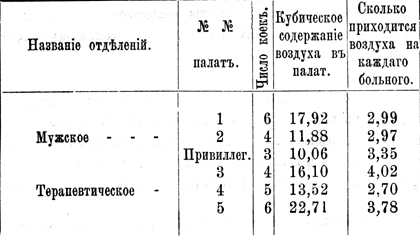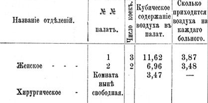 Следующая таблица укажет на число палат, количество коек, и кубическое содержание воздуха в каждой палате, со включением и хирургического отделения.