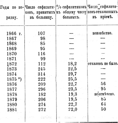В нижнем этаже в обоих крыльях здания помещены мужское и женское сифилитическая отделения. До 1874. года здесь помещались умалишенные. Так как штат сифилитиков ограничен (35 кроватей), поэтому нередко приходится отказывать в приеме, отсылая в таком случай больных в сифилитическую лечебницу, состоящую в ведении Вологодского уездного Земства. Следующая таблица покажет движение сифилитиков по годам за 16 лет, с 1866 по 1881 год включительно и % отношение их к общему числу поступающих больных за последние 10 лет.