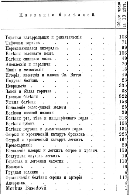 В последней таблице приложения показано движение больных в Вологодской губернской земской больнице по роду болезней за 10 лет е 1872 по 1881 год включительно.