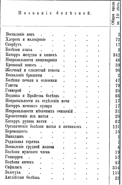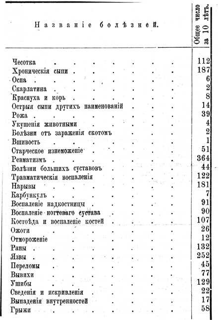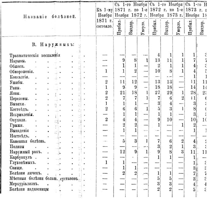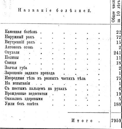 В числе амбулаторных больных дворян было 149, чиновников — 589, купцов —197, духовного звания — 474, воспитанников разных заведений — 310, мещан —1301, крестьян — 3534, отставных солдат -1096, богадельщиков — 291, иностранцев—18.