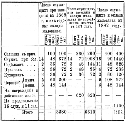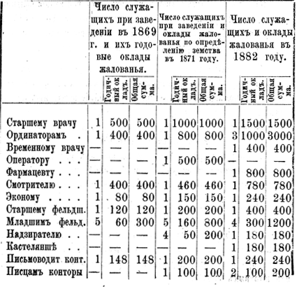 С постройкой нового дома умалишенных и увеличением числа психических больных, понадобилось пригласить (в 1877г.) особого врача специально для заведывания отделением душевных больных. Увеличивая, число врачей, земство не оставило без внимания и степень их матер1альнаго обеспечения. По мере того, как условия жизни становились дороже, земство прибавляло жалованья и это относилось не только врачам, но и к прочим служащим при больнице. Для доказательства только что сказанного, я приведу следующую ведомость с указанием числа служащих и оклада их жалованья при Приказе Общественного Призрения, в первый год открытия земства и в настоящее время.