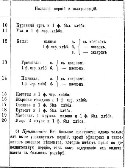 Больные пользовались прежде содержанием по положению, согласно уставу лечебных заведений. В 1876 году составлена новая табель порциям (см. в конце отчета). В настоящее время больные получают в обед одну из показанных в табели порций и на ужин суп или щи без говядины. Сверх того по усмотрению врачей назначаются экстрапорции.