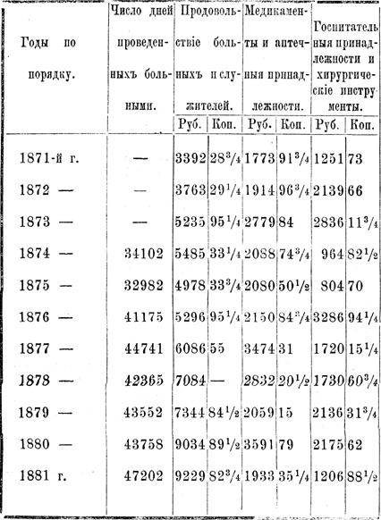 Весь расход Вологодского Губернского Земства на покупку медикаментов и аптечных припасов для больницы за 11 лет, т. е. с 1871 по 1881 год включительно равняется 31,237р. 68 кол., средним числом в год 2839 руб. 79 копеек.