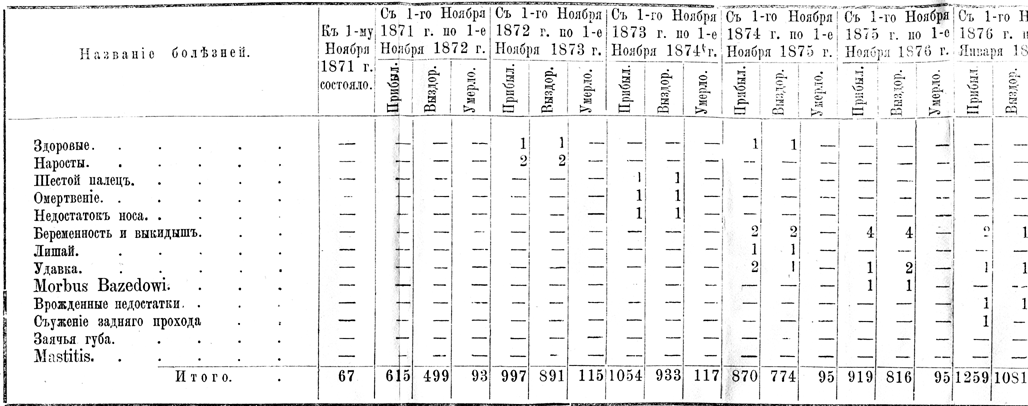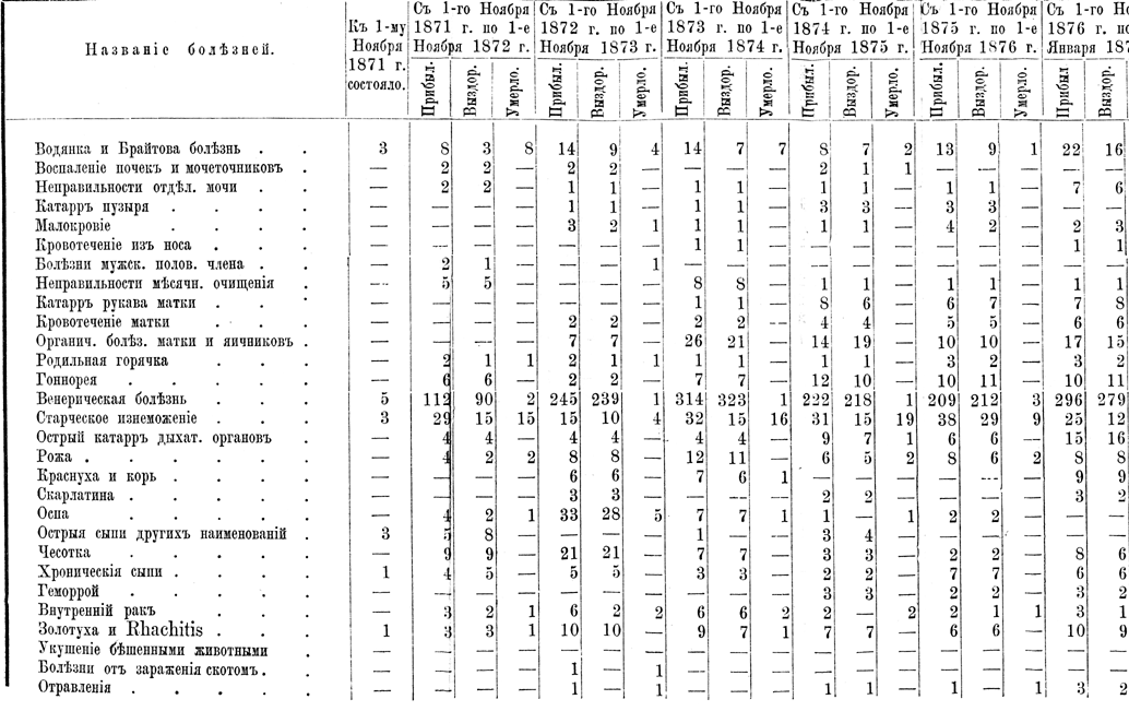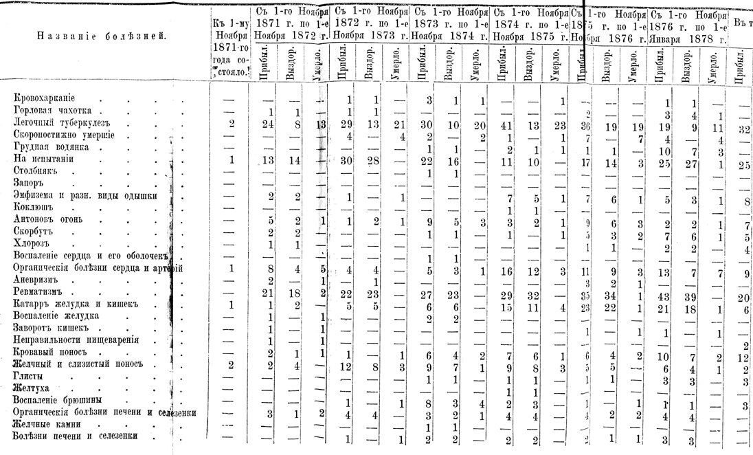 Случаи тифа в больнице бывают почти постоянно по зимам, составляя от 3,2% (1876 г.) до 15,1 процентов общего числа больных (в 1872 г.)