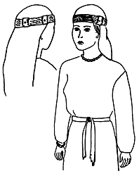 Головной убор. Это важнейшая часть женского костюма. У большинства народов головные уборы девушек, замужних женщин, пожилых значительно отличались друг от друга. Замужняя женщина должна была тщательно закрывать свои волосы платком или покрывалом, в то время как у девушек они могли придерживаться лентой из материи или полоски кожи. Такой "венчик" являлся в конце 1 тысячелетия до н. э.- 1 половине 1 тысячелетия н. э. у финно-угорских женщин ведущим элементом в головном уборе. Сделанный из полоски кожи или плотной материи он украшался мелкими бронзовыми изделиями: спиральками, бляшками-розетками, скобочками, бляшками-скорлупками, из которых мог быть образован узор. При раскопках "домика мертвых" у д. Куреваниха найдены сплавы бронзовых скобочек (иногда более 20 вместе). Это указывает на то, что в костюме они располагались вплотную. Ряды скобочек разделялись бляшками-скорлупками, имевшими петельку для привешивания с внутренней стороны.