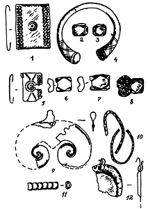 Рис. 5. Украшения из славянских курганов Любанихин-1 V-VI веков н. э.: 1-4 - курган № 3; 5 - 8 - курган № 6; 9 - 12 - курган № 1. |