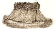Устроив таким образом подпору с обеих сторон, начинают, как было уже сказано, устанавливать пучки льна в наклонном положении, стараясь приложить первые из этих пучков семенными головками к одному из кольев, дабы они не могли упасть; таким образом продолжается укладка пучков до тех пор, пока не достигнуть второго кола, служащего крыше подпорою с другого ее конца; в результате получается крышеобразное расположение, как это видно на фиг. 1.
