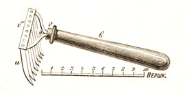Местами, например, в Псковской губернии, льняные голодовки отделяют от стеблей драчками; этот способ отделения головок мы встречали во многих волостях Псковского уезда. Насколько нам удалось проследить появление драчки в г. Псковской, она впервые была выписана купцом Б. (Псковского у.), несколько лет тому назад. Состоит она (фиг. 2) из железной планки б, приклепанной к стойке д, которая в свою очередь вогнана в деревянную рукоятку в с железным кольцом г; в планку б на расстояние ? вершка один от другого, приклепаны или привинчены гайками 8 косообразных ножей, с острием, направленным к ручке. Ножи имеют вид косы, длиною в 4 вершка в верхнем конце, шириною в ? верш., толщиною в 1/16 верш. Планка б из железа толщиною в 1/16 верш., шириною в ? вершка, длиною в 4 вершка. Стойка д полукругом скована из четырехгранного железа в 1/8 вершка; деревянная рукоятка — длиною 12 верш., толщиною в тонком месте у г 1 верш., а в толстом 1? верш, и с округленным концом. Крестьянские драчки, местного изделия — с железными ножами, приклепанными к планке, что отчасти затрудняет точение ножей; в некоторых селах мы встречали драчки заграничной работы со стальными ножами, которые оканчиваются нарезной цапкой; последняя пропускается сквозь планку и привинчивается гайкою, почему зубья или ножи легко могут быть отвинчены или привинчены, что очень облегчает точение их. Заграничные и местные драчки тоже совершенно одинаковы по величине и размеру их, так как местные сделаны по образцу заграничных; разница лишь в том, что у последних ножи отвинчиваются, и отделка чище.