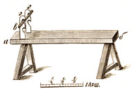 Для обдирания семенных головок драчкою, защемляют сноп между брусьями так, чтобы семенной конец снопа можно было со всех сторон ободрать драчкою. Для более удобного защемления снопов при их обдирании, в некоторых деревнях делают особые скамьи или стойки. Стойка (фиг. 3) — нечто иное как довольно высокая скамья, к верхней доске которой (аб), с обеих сторон конца а, приделаны в вертикальном положении две планки гг; в последние врезаны на равной вышине два уступа для округленной палки в. Сноп кладется между планками и так, чтобы семенной конец снопа свешивался — на конец а доски аб; после чего палка в с силой вдавливается в один из уступов. Если сноп большой вязи, то достаточно перекладину в втиснуть в два верхних уступа, чтобы сноп держался, не поддаваясь при дергании драчкою; если же сноп маленькой вязи, то перекладина втискивается в нижнюю пару уступов. Сноп, защемленный в подобной стойке, довольно удобно обдирается драчкою с трех сторон — верхней и боковых; потом сноп перещемляется, т. е. его оборачивают низом вверх; работа идет чрезвычайно быстро.