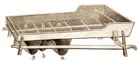 Решето, как уже сказано, состоит из нескольких маленьких решет. Если мочило имеет 12 ф. ширины и 20 ф. длины, то решето может быть составлено из десяти небольших решет в 6 ф. длины и 4 ф. ширины каждое. Все они скреплены друг с другом, чтобы не гнулись и сплачивались возможно лучше в одно целое; кроме того они прикреплены к деревянной раме с перекрестной; станки этой рамы также не должны быть толще 2-х и не шире 4-х дюймов для того, чтобы избегнуть лишней тяжести решета.