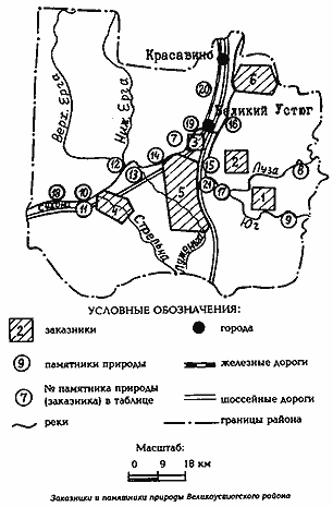 Немало редких и уникальных природных объектов взято под охрану в Великоустюгском районе (см. табл., рис.). Даже в самых крупных районах области - Вытегорском и Бабаевском - количество заказников и памятников природы не превышает 10-15, а в Великоустюгском под охрану взят 21 природный объект. Причиной тому являются особенности природы района, который расположен в трех ландшафтах Двинско-Сухонской физико-географической области: Нижне-Югском, Верхне-Ергинском и Кичменгском. Для них характерно большое разнообразие природных комплексов, которое во многом определяется наличием многочисленных рек. Самые крупные из них - Малая Северная Двина, Сухона, Юг и Луза - образуют здесь глубоковрезанные долины, обрамляющие высокие водоразделы, склоны которых густо расчленены ручьями, логами и оврагами. Хорошая дренированность большей части территории и продуктивные почвы создают благоприятные условия для повсеместного произрастания различных древесных пород: сосны, ели, лиственницы и пихты. Былые таежные леса еще в начале века вызывали восхищение лесоустроителей.