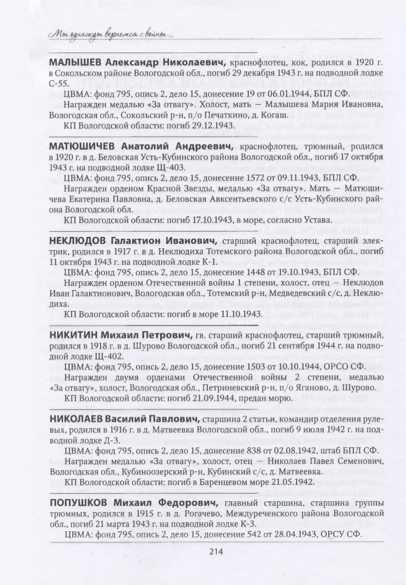 в Сокольском районе Вологодской обл., погиб 29 декабря 1943 г. на подводной лодке
