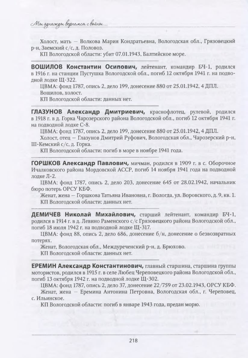 КП Вологодской области: погиб в январе 1943 года, предан морю.