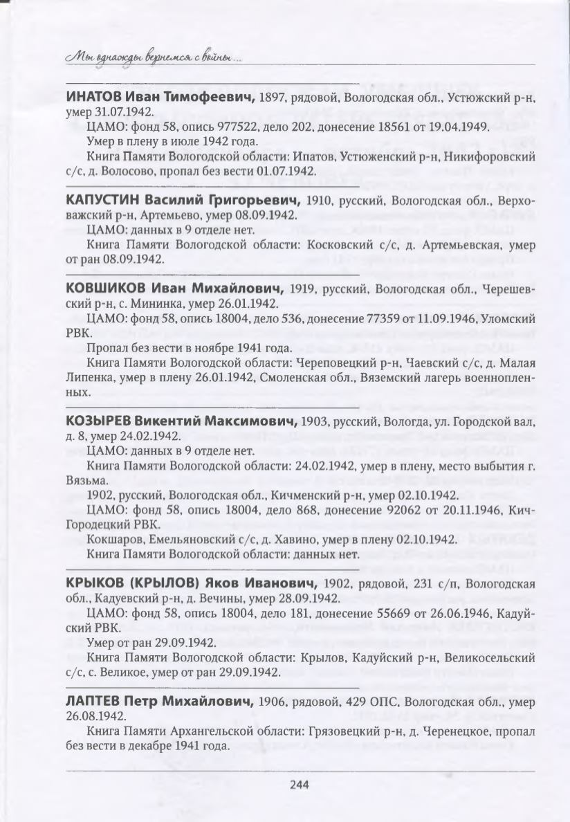 Книга Памяти Вологодской области: 24.02.1942, умер в плену, место выбытия г.