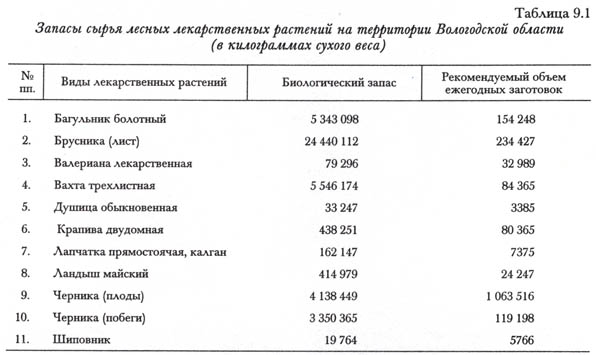 Жители Вологодской области с давних пор знали о целебной силе некоторых растений. Эти знания переходили из поколения в поколение в виде легенд и преданий. Первые литературные сведения о лекарственных растениях Вологодской губернии появились в 1826 году в работе Г. Фортунатова, где автор указывал 45 видов лекарственных растений, встречающихся в окрестностях города Вологды. В 1883 году А. И. Куклин (48) публикует список лекарственных растений, используемых вологжанами. В 1916 году Н. В. Ильинский (38) в работе «О лечебных травах на Севере, в частности, в Тотемском уезде, обращает внимание на необходимость выяснения потребности в лекарственных растениях и возможности вывоза сырья за границу. Три года спустя, в 1919 году, автор (39) дает рекомендации по использованию 44 видов лекарственных растений. В 1920 году Н. В. Ильинский (40) сообщает, что в Вологодской губернии сбор спор плауна имел промышленное значение и даже практиковалась промышленная культура некоторых лекарственных растений, в частности в предприятии Н. В. Попова-Введенского в имении под Кадниковым. Здесь использовалась сушилка для быстрой сушки мяты и листьев вахты. Существовал завод, на котором получали эфирные масла (сосны, ели, можжевельника, мяты), «добывался» сосновый экстракт для ванн. Все продукты отправлялись в Германию. И. А. Перфильев во «Флоре Северного края» (83) дает экологическую и фитоценотическую характеристику известных к тому времени лекарственных растений. Е. М. Поповская (89) в 1941 году изучает шиповники окрестностей Вологды и предпринимает попытку определить урожайность плодов. В 1961—1962 годах на территории Вологодской области работала экспедиция Ленин-градского химико-фармацевтического института по изучению лекарственных растений, но полученные ею данные далеко не полны. Исследования проводились выборочно, по рекогносцировочным маршрутам, и выявленные сведения не отражают богатства запасов сырья лекарственных растений на территории области. В 1965 году был издан «Атлас Вологодской области» (7), в котором помещена карта распространения по территории области 13 видов лекарственных растений. Определенные сведения о распространении и запасах сырья отдельных видов по территории области приводятся в «Атласе ареалов и ресурсов лекарственных растений СССР» (6), вышедшем в 1980 году. При проведении лесоустройств работники лесных хозяйств обращают внимание на лекарственные растения, поэтому в материалах лесоустройств имеются сведения о запасах сырья некоторых видов. Целенаправленные исследования ресурсов лекарственных растений области начаты в 1982 году сотрудниками кафедры ботаники Вологодского государственного педагогического института. На сегодняшний день определены запасы лекарственных растений во всех 26 районах области (таблица 9.1).