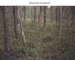 Видовому составу лишайников эвтрофных и мезотрофных облесенных болот свойственна факультативность, большинство видов случайны и характерны для других лесных экотопов, прежде всего сосняков. В долгомошных, долгомошно-сфагновых сосняках и на облесенных олиготрофных болотах, кроме случайных видов, встречаются типичные, так называемые облигатные болотные лишайники, например кладония синеножковая (Cladonia cyanipes (Sommerf.) Nyl.) и икмадофилла пустотная (Icmadophila ericetorum (L) Zahlbr.), образующая большие пятна накипных слоевищ голубовато-зеленого цвета с ярко-розовыми апотециями на отмирающих мхах, на торфе вдоль откосов мелиоративных канав.