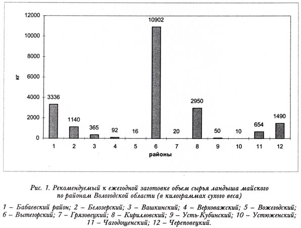 В результате многолетних нерегулируемых сборов, строительства дорог, разработки карьеров, вырубки лесов запасы сырья ландыша значительно уменьшились. В настоящее время возможна заготовка только для нужд области в Вытегорском, Бабаевском, Кирилловском, Белозерском и Череповецком районах. В других районах области запасы сырья ландыша практически отсутствуют (рис. 1).