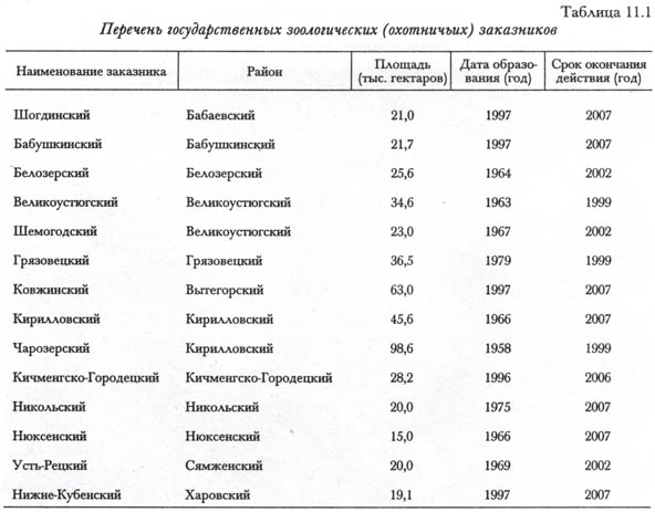 На 1 мая 1998 года государственные зоологические заказники в Вологодской области занимают территорию площадью 471,9 тысячи гектаров. В заказниках ежегодно проводятся зимние маршрутные учеты охотничье-промысловых видов животных, а также летне-осенние учеты водоплавающей и боровой дичи, околоводных пушных зверей. Эти мероприятия позволяют планировать проведение биотехнических, охранных и других мероприятий, направленных на поддержание оптимальной численности ценных диких животных, редких и исчезающих видов.