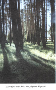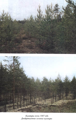 Большинство культур довоенного периода характеризуется относительно высокой первоначальной густотой создания — от 5 до 10 тысяч посевных мест на 1 гектар. Создаются чистые культуры, а формирование смешанных насаждении происходит за счет естественно возобновившихся на участках культур лиственных пород — березы и осины. Такой путь оправдан и с лесоводственных и с экономических позиций и предопределен самой природой таежных лесов.