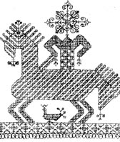 Главным элементом их служит древнейший мотив свастики, усложненный или раздробленный в бесчисленном множестве остроумных геометрических вариаций (так называемые «гребни», «расковка», «козыри», «крылья» и пр.). На этом мотиве, как на основе, развертывается художественная изобретательность вышивальщиц.