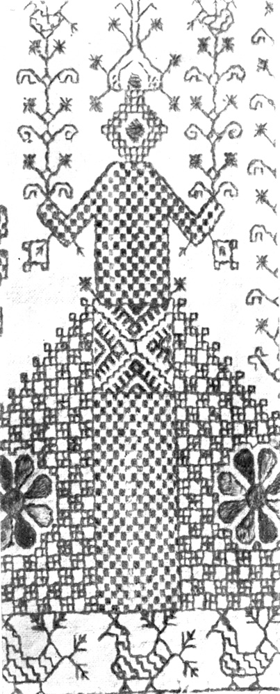 Богатую и особенно оригинальную культуру графической линии крестьянской вышивки представляет главным образом северная фигурная вышивка красной нитью на подзорах простынь и концах полотенец. Она содержит в себе исключительно древние орнаментальные слои русского искусства. Образы неведомых вышивальщицам богов и богинь, символических зверей и птиц в ритмичных графических построениях образуют прекрасные магические узоры на этих бытовых холстах. Красная нить в ряде различных технических приемов шва (настилом, квадратом, крестом и др.) достигает высоких степеней четкости, ритма, выразительности; ряды человеческих фигур, барсов, всадников, коней, птиц, строений, вазонов, дерев находят себе оригинальные выражения в так называемом геометрическом стиле.