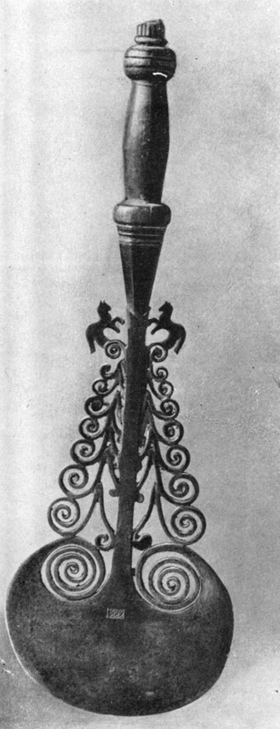 Скульптурные принципы в их характерном бытовом преломлении выражаются и в оригинальных изделиях кузнечного дела. Железные светцы для лучин - своеобразные предметы бытового крестьянского уклада - служат тому примером. Будучи разрешены и построены на принципе силуэта, они в то же время неизменно заключают в себе и элементы скульптурного построения.