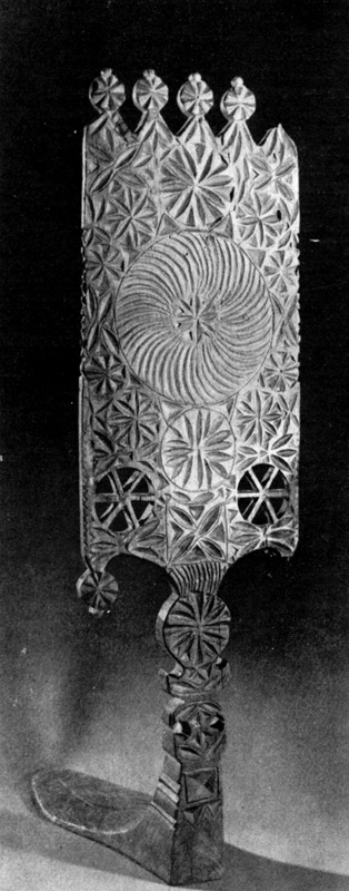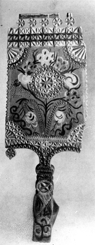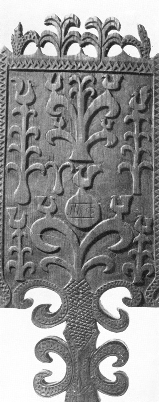 Существует без сомнения и еще ряд местных обозначений прялки и ее частей; но разыскание этих названий не входило в задачу настоящей работы. По характеру декоративной обработки народные русские прялки можно разделить на две главные группы: расписные и резные. Последние, если можно сослаться на сохранившийся в отечественных музеях крестьянский хозяйственный инвентарь, по-видимому, численно преобладают. Третья, дополнительная или промежуточная группа, носит смешанный характер обработки: это прялки резные-расписные или расписные-резные, смотря по тому, какой из элементов украшения преобладает. Смешанный характер декоративной обработки (роспись и резьба) нужно признать случайным. Обыкновенно, тип прялки неотъемлемо соединен с каким-нибудь одним способом украшения: например, прялки ярославско-костромского типа украшены контурной резьбой, и роспись на них почти не встречается; прялки архангельско-вологодского типа украшены росписью, и резьба на них - явление лишь эпизодическое. Но смешение или соединение росписи с резьбой встречается почти во всех типах - и это побуждает обозревателя отметить промежуточную группу.