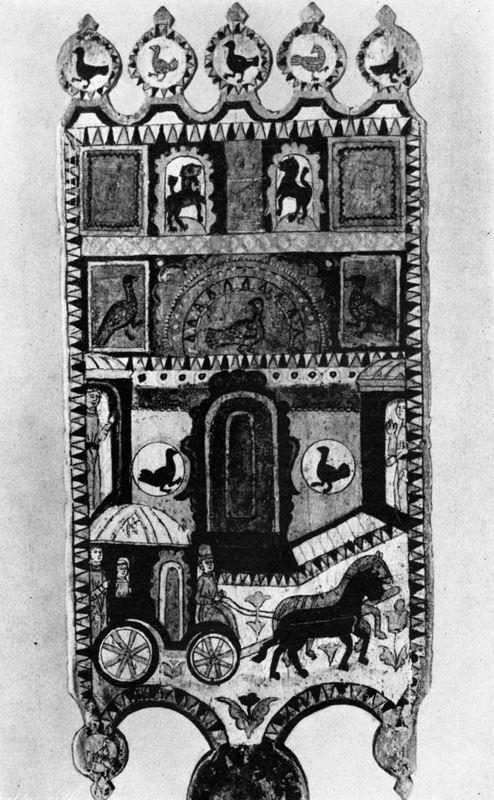 Вопрос о переходных формах приходится до времени оставить в стороне за отсутствием доказательных материалов. Следует еще добавить, что исследование палеографических, эпиграфических и литературных материалов (надписи, стихи, народный язык и т. д.), представляемых прялками так же, как и многими другими предметами народного быта и искусства, должно составлять особую (совершенно еще не тронутую) задачу в области исследования русского народного языка и не входит в рамки предлагаемой работы. Для настоящей работы автором были осмотрены, частью сфотографированы и зарисованы прялки и донца следующих музеев: в Москве - Российский Исторический музей, отделение П. И. Щукина; Государственный Румянцевский музей (этнографическое отделение); Кустарный музей бывш. Московского Губернского земства (музей образцов); Художественно-промышленный музей при Строгановском училище (ныне расформированный); в Ярославле - Ярославское древнее хранилище; в Ростове - музей Белой Палаты; в Новгороде - музей древностей; в Пскове - музей псковского Археологического общества; в Угличе - музей царевича Дмитрия; в Киеве - Художественно-промышленный музей; в Казани - Научно-промышленный музей; в Твери - Тверской музей; во Владимире - музей архивной комиссии; в Вологде - музей Славянского кружка любителей изящных искусств; в Архангельске - городской музей и некоторые частные собрания.