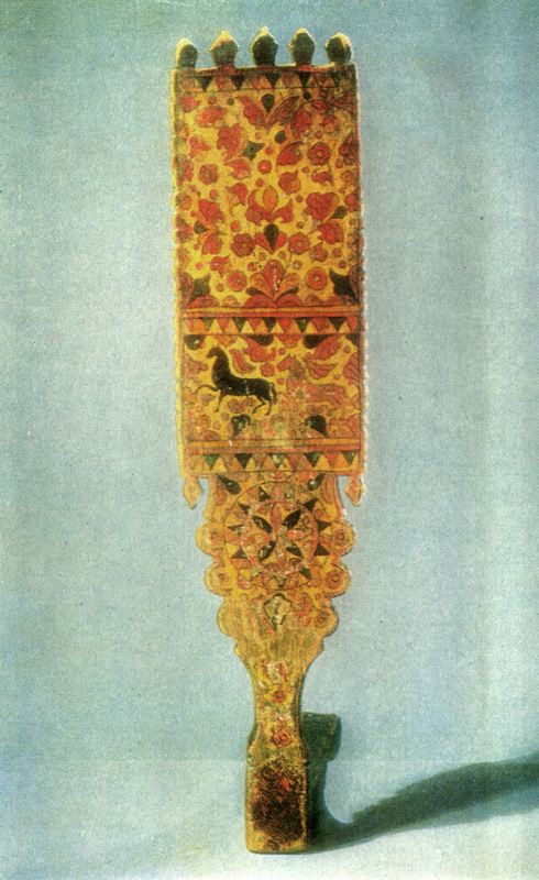 Значительная группа народных прялок по характеру своей красочной декорации в музейных описях получила название расписных прялок. Краски, по-видимому, в меньшей степени, нежели резьба, но все же в значительной доле, употреблялись, как средство украшения народных русских прялок.