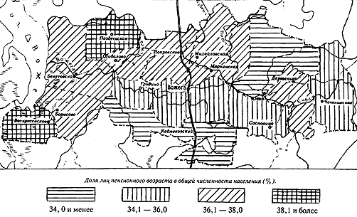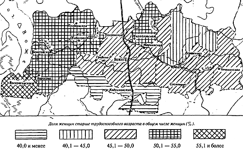 Постоянный отток населения из района вызвал не только снижение его численности, но и ухудшение качественного состава. Самые значительные изменения произошли в соотношении возрастных групп населения (карты 2, 3, 4). Отъезд молодых трудоспособных людей, продолжавшийся несколько десятилетий, привел к "старению" населения района и значительному снижению доли трудоспособной его части. В настоящее время (данные 1993 года) лица пенсионного возраста в районе составляют 29,1% (по области - 21,4%), а трудоспособное население - всего 47,0% (по области - 54,6%). Особенно сильно процесс "старения" проявился среди сельских жителей, где доля стариков составила 32,3% (по области - 27,4%), а доля трудоспособных - 44,8% (по области - 48,4%). В самом поселке Вожега состав населения лучше, но и здесь показатели значительно отличаются от средне-областных: стариков - 22,5% (по области у городского населения - 18,2%), трудоспособных - 51,6% (по области - 57,9%). Таким образом, район значительно опережает область в процессе "старения" и сокращения доли трудоспособного населения, особенно сельского. Наиболее трудообеспеченными можно считать Кадниковской и Ючкинский сельсоветы, в которых доля трудоспособного населения составляет соответственно 45 и 49%. Менее 40% трудоспособных - в Нижнеслободском, Огибаловском, Пунемском, 40-42% - в Вожегодском, Марьинском, Мишутинском сельсоветах.