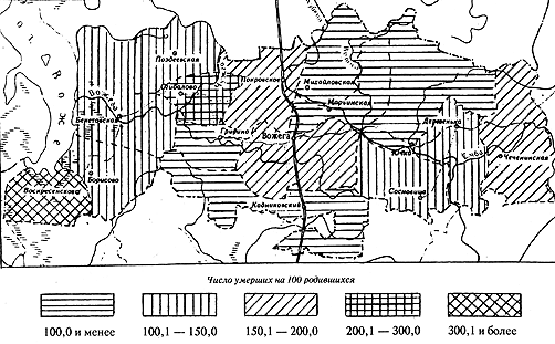 К двум уже описанным демографическим ситуациям - оттоку населения и его "старению" - в последние годы прибавилась третья - депопуляция, т.е. уменьшение численности населения территории, наступающее при превышении смертности над рождаемостью. У сельского населения отрицательный естественный прирост отмечается с конца 1980-х годов, а в 1992 году он составил минус 7,6 человека на тысячу жителей. До 1992 года рождаемость, пусть и незначительно, превышала смертность в Кадниковском, Марьинском, Тигинском и Ючкинском сельских советах, т.е. в четырех из пятнадцати. В остальных одиннадцати, уже начиная с 1989 года, смертность превысила рождаемость: более чем в 1,5 раза - в Вожегодском, Мишутинском, Явенгском, более чем в 2 раза - в Огибаловском и в 4 раза - в Пунемском сельсоветах. География этого явления нашла отражение на карте 5 ("Соотношение рождаемости и смертности населения Вожегодского района за 1989-1991 гг.").
