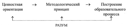 Разумная деятельность ума – это диалектико-логическая деятельность. Она и организует построение научного исследования и образовательного процесса, их движение в соответствии с выбранным методологическим принципом. Но этот выбор также разумный: обоснованный и целесообразный, который, в свою очередь, обусловливается ценностными ориентациями человека. Последние могут находиться под влиянием многих факторов: объективных и субъективных, профессиональных, социальных, идеологических, личностных. Разумность ценностных ориентации педагога заключается в сознательной ориентации на ребенка, на заботу о его человеческом становлении. «Нет ребенка – нет проблем, нет нужды в педагогической практике, в педагогической теории. Есть ребенок – все приходит в движение», – просто и верно замечено [Ежеленко В. Б. Новая педагогика. Теория и методика педагогического процесса: Учебное пособие. – СПб.: Издательство РГПУ им. А. И. Герцена, 1999. – С. 11.]. Ниже представленная схема дает хотя и упрощенное, но некоторое представление о роли разума в диалектико-логической деятельности при решении научных и образовательных проблем.