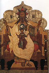 В местном ряду иконостаса Успенского собора располагалась также и икона «Богоматерь Одигитрия» (1497, ГТГ), сочетающая черты новгородской и московской школ живописи (илл. 87). Фигура богоматери трактована в обобщенно-монументальных формах. Лицо ее слегка повернуто к младенцу. В верхних углах иконы изображены склонившиеся к Марии ангелы; их контуры образуют плавные полукружия. Богоматерь одета в лилово-коричневый мафорий, левый ангел — в светло-сиреневые одежды, правый — в зеленоватые. Общий фон иконы — золотой. Сочетание этих немногочисленных тонов еще более подчеркивает монументальность изображения, придает ему необычайную торжественность.