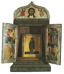 Любопытно, что серебряные басменные оклады всех праздничных икон, в особенности закрывающие средники, восходят к работам новгородских серебреников XVI в., украшавших «басменные фоны» своих произведений такими же мелкими чешуйками,