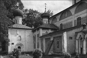 Почти в середине крепостной стены, обращенной к Сиверскому озеру, находятся Водяные ворота с надвратной церковью Преображения, входящие в систему монастырской ограды Старого города. Обе постройки относятся к XVI в. (илл. 93). Но ворота возникли ранее храма, возведение которого датируется 1595 г. Они имеют, как обычно, два арочных проезда разной величины и палаты хозяйственного назначения по сторонам: с востока — кладовую, с запада — калачную и просвирную. Декоративная обработка ворот со стороны двора очень близка к убранству Святых ворот: килевидные архивольты арок проездов и прямоугольные, иногда с острым верхом ниши на устоях.
