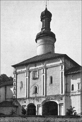К юго-западу от Успенского собора стоит оригинальная, но сильно искаженная в верхней части позднейшими переделками церковь Архангела Гавриила. Ее строительство было осуществлено в 1531—1534 гг. на вклад великого князя Василия III, сделанный им во время поездки на богомолье в 1528 г. На первый взгляд здание выглядит довольно традиционно (илл. 89). Высокий кубический объем с трехмастным членением фасадов пилястрами и с тремя низкими полукруглыми апсидами, с арочными окнами без обрамлений и с кирпичными перспективными порталами обычной формы (сохранился лишь северный), находится в русле прежних художественных взглядов. Однако стройные пилястры с базами, создающие четкий вертикальный ритм, профилированный цоколь и широкий трехчастный антаблемент «классического» типа с раскреповками над пилястрами свидетельствуют о широком использовании новых приемов и форм, привнесенных в русское зодчество на рубеже XV—XVI вв. итальянскими мастерами. Своеобразна и аркатура на апсидах, близкая к декору ряда памятников Москвы начале XVI в.