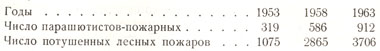 В 1949 г. на авиационной охране лесов работал 21 парашютист и непосредственно парашютистами-пожарными было потушено всего лишь три лесных пожара. Приведенные ниже данные свидетельствуют о развитии парашютно-пожарной службы в последующие годы.
