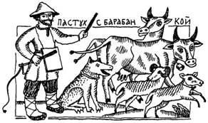 Чуть снег сойдет, в полях травка зазеленеет, начинают коров на пастбище гонять. Не всегда за ними пастухи присматривают, иногда коровушки и сами по лесу пасутся: места вокруг села глухие, чужие люди редко захаживают, а медведи да волки уже давно поповывелись, разве что шатун какой забредет. Коровушкам на шею, чтоб они не потерялись, колокольцы большие вешают, так что их в лесу далеко слышно. А если в деревне пастух есть, он коровушек барабанкой или рожком созывает. Барабанка- это такая дощечка, ее пастух на шею вешает; а как нужно ему коровушек вместе собрать, он по барабанке начнет палочками постукивать, да так звонко - по всему лесу аукнется. Коровушки как услышат барабанку, так все к пастуху и сходятся, домой спешат.