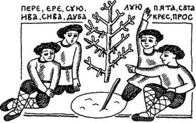 развилистую, на которой побольше сучьев; листья или хвою с нее оборвут и воткнут комлем в землю, а вокруг землю от травы расчистят - небольшой с полметра, кружок сделают. Потом разбантуются считалочкой: