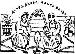Ворожит ребятня пока понарошку, а вот взрослые девушки, сказывают, настоящее гадание устраивают - в не-жировой избе, где никто давно не живет. Туда в полночь идут не крестясь и нательный крест обязательно снимают, а то не «поблазнйт», то есть ничего не увидишь. В избе этой надо залезть на печку, свечу зажечь и ставить ее на голбец, а потом на свечу через дугу лошадиную смотреть и приговаривать: «Дьяво, дьяво, явись вьяво!» И тогда, говорят, увидишь все, что завечаешь [*] [Завечать - загадывать, думать о чем-либо втайне от всех.]. Одна девица загадала увидеть свадьбу свою. И правда, видит, дверь-то распахнулась, и прямо в полые двери столы заносят, пироги свадебные да всякие угощения на них ставят. Народу много собралось, да ни у кого головы не видно; все будто говорят что-то, да вот слова не наши, речь чудная, неясная. Потом глядь - жениха и невесту заводят. Пригляделась, ан это вроде как она сама со своим парнем, за которого замуж собиралась, идет. Только вот парень-то вот уж два года