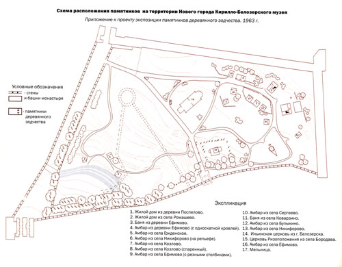 Для размещения памятников деревянной архитектуры была выбрана часть территории Нового города Кирилло-Белозерского монастыря, слева от аллеи, ведущей от Казанской башни к Святым вратам, общей площадью 2,5 га. Размещение памятников деревянной архитектуры внутри монастырских стен, по мнению автора проекта, имело свои достоинства и недостатки. К достоинствам можно было отнести благоприятные условия для показа памятников, определенную изолированность данного фрагмента территории от основной части монастырского ансамбля, наличие исторических сведений о размещении на данной территории деревянных хозяйственных построек Кирилло-Белозерского монастыря, присутствие на данной территории сторожевой охраны. К явным недостаткам относились сравнительно незначительные размеры площадки, не позволяющие создать полноценный музей деревянного зодчества, как в Кижах или в Малых Корелах, сосредоточение памятников деревянного зодчества внутри крепостных стен создавало для них новую искусственную среду, не характерную для их обычного расположения в открытом ландшафте. Последнее обстоятельство авторы проекта попытались скрасить за счет выборочного озеленения территории.