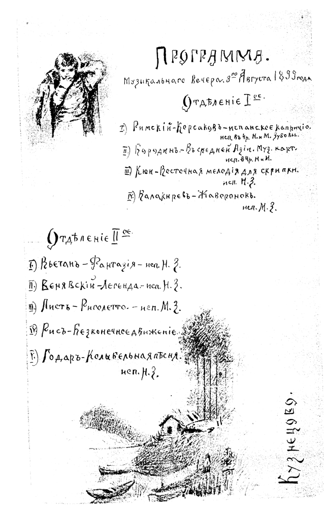 В городе прошло и несколько гастрольных концертов. Главные из них, конечно, концерт блестящей пианистки А.Н. Есиповой с известным скрипачом Л. Ауэром, у которого в Петербургской консерватории училась сестра Нина Юльевна, и сольный концерт Сергея Рахманинова. А.Н. Есипова была рада видеть М.Ю. Зубова и благодарила за преподнесенный венок. О концерте С.В. Рахманинова Михаил Юльевич записал свои впечатления так: «Пока он играл, я не замечал ничего особенного. Тонко, гладко, мастерски. А чем дальше, тем больше вспоминаю и ценю. Удивительно хорошо! Как много положительных сторон и ничего, рассчитанного на эффект! Он вроде Шаляпина. Высокого роста. Коротко стриженый. Бритый. Белобрысый. Такое спокойствие, как у него, ничем другим нельзя объяснить, кроме как сознанием своей силы, верой в нее... И ничего особенного не кажется только в первый момент, а потом видать: что это такое!» [3].