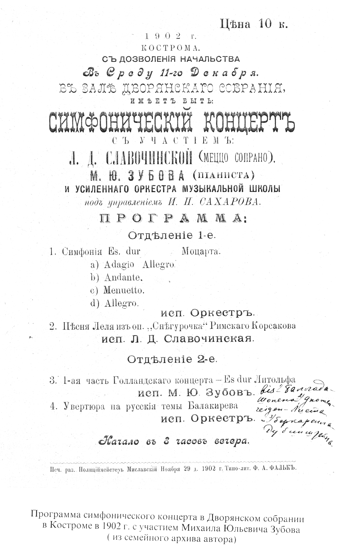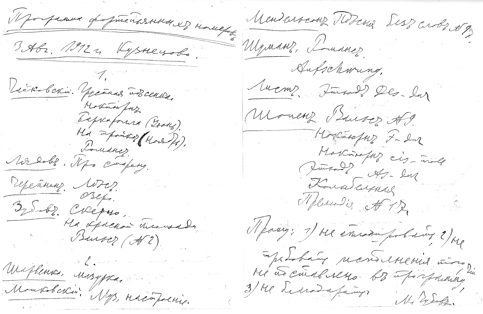 А для анонса концерта М.Ю. Зубов послал следующую программу: Бетховен «Аппассионата», Скарлатти «Пастораль», Корелли-Фриденталь «Гавот», Шопен «Баллада № 3», Лист «Этюд», «Gnomen-Reigen», «На берегу моря» и «Вальс-экспромт», Рубинштейн «Гондольера» и «Лезгинка» (из оперы «Демон»), Мошковский