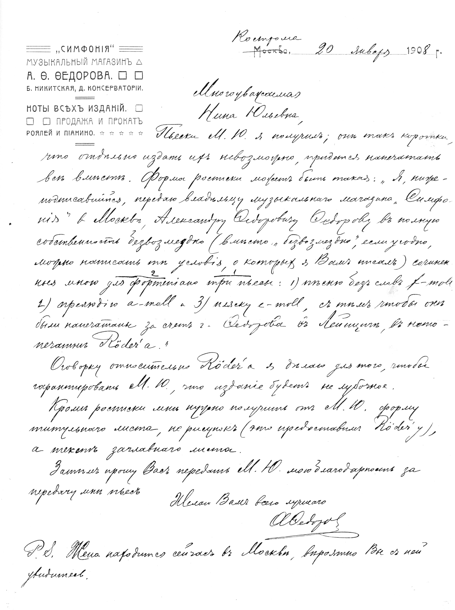 Из московского музыкального магазина «Симфония», расположенного в здании консерватории, был получен ответ А.Ф. Федорова, содержащий согласие напечатать три пьесы М.Ю. Зубова в Лейпциге у Родера по 200 экземпляров вместе и по 200 экземпляров отдельными тетрадями с уплатой 10% от стоимости проданного тиража (примерно 30 рублей, или записать в торговых книгах «Симфонии», как вклад композитора в магазин с 6% годовых). При этом Михаил Юльевич должен был прислать текст титульного листа, расписку о передаче пьес в собственность хозяина магазина и просмотреть корректуры перед печатью. Михаилом Юльевичем были посланы А.Ф. Федорову «Песня без слов», «Прелюдия» и «Пляска» [3]. К сожалению, осталось неизвестным – были ли опубликованы эти фортепьянные произведения М.Ю.Зубова, а также написанное им в марте 1908 года на 7-ми страницах большое «Скерцо», которое он рассматривал как свое первое существенное сочинение и «экзамен на звание композитора», и просил сестру Нину Юльевну показать его С.И.Танееву [3].